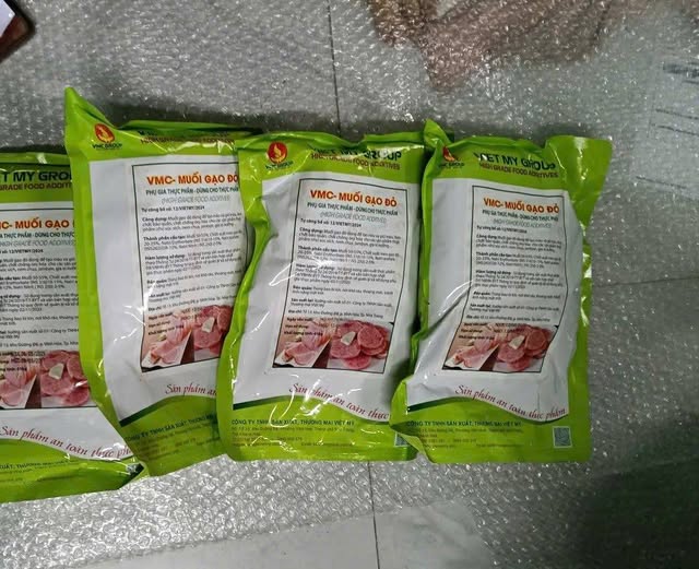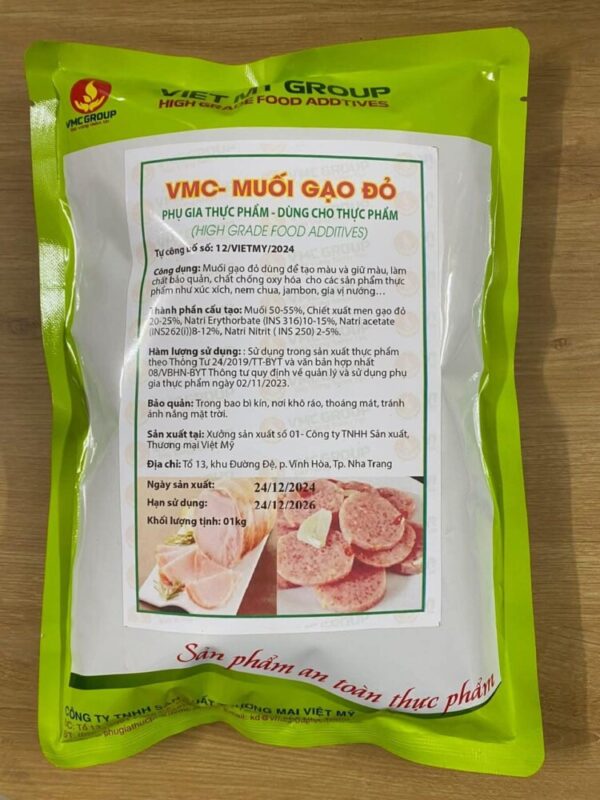 VMC Muối gạo đỏ là phụ gia thực phẩm chuyên dùng trong chế biến xúc xích, nem chua, jambon, lạp xưởng, thịt nguội… Sản phẩm có tác dụng tạo màu hồng tự nhiên, đẹp mắt, bền màu, giúp nâng cao giá trị cảm quan và chất lượng sản phẩm.